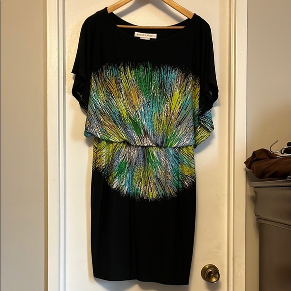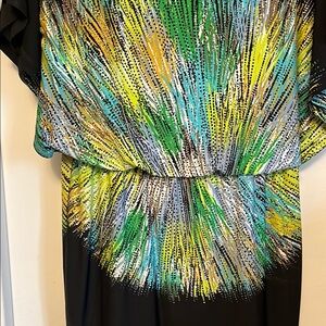 Stylish black dress featuring a vibrant multicolor pattern. Perfect for any occasion.