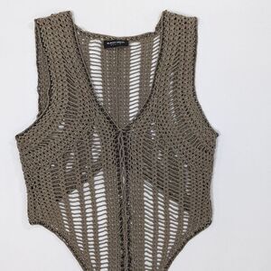 This little cotton crochet vest had one tie at the top originally, but I felt it would look better completely closed all the way down. I wove the ties into a lace up down the center front & secured the ends with needle & thread. It could easily be undone though. Over the head with this & it can be worn either way.