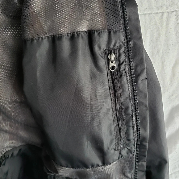 Removable hood, Inside pocket with zipper, two outer pockets with zippers.