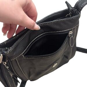 Sleek and versatile black faux leather crossbody bag. Features adjustable strap, flap closure with silver-tone buckle detail, and contrast stitching. Front zip pocket and multiple compartments inside provide organization for daily use. Includes a cute matching apple-shaped keychain charm.