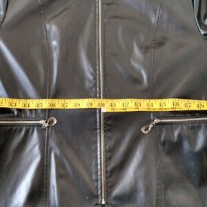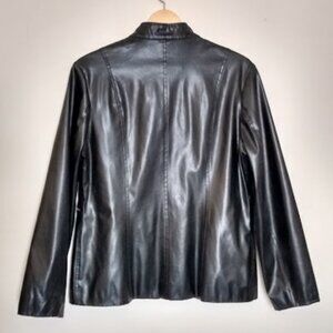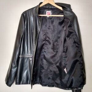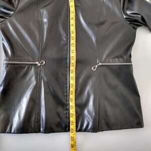 Sleek and stylish black faux leather jacket perfect for any occasion. Features a modern design with zippered pockets for added functionality.