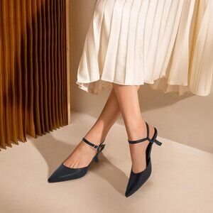 🆕Black Faux Leather Women's Pointed Toe Kitten Heels Ankle Strap Wedding Shoe