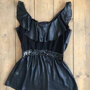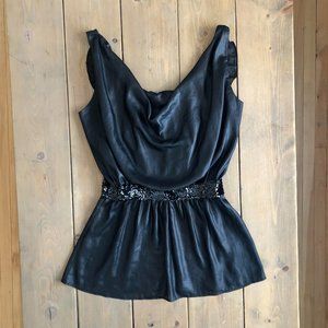 This is a beautiful black dressy top. It has a Grecian Goddess look to it. You'll feel like a princess in this one. No marks, spots or tears. Smoke free home. It has a sequin waist that sinches in. Comfy for looking so classy!
