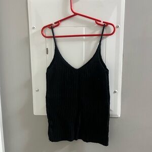 This black camisole showcases a sleeveless design with a V-neckline and thin spaghetti straps. Crafted from a soft ribbed fabric, it offers a fitted silhouette that flatters your figure. Ideal for layering or wearing alone, this top is a stylish staple for any wardrobe.