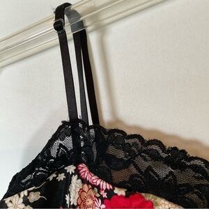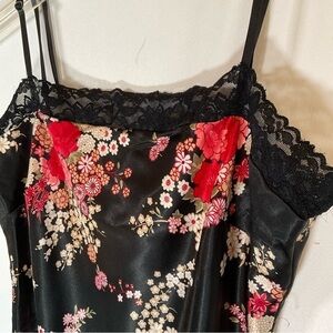 Silky camisole top, black with pink gold white and red cherry blossom flowers with adjustable straps and lace, Small .