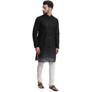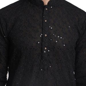 Black Floral Embroidered Chikankari Kurta Pyjama Set For Men