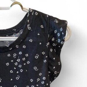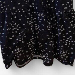 Black floral patterned midi dress with ruffled short sleeves and a three-section tier