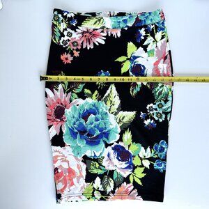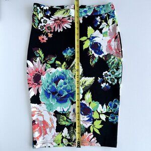 This is a bright pencil skirt in size S. It's made from a stretchy jersey fabric composed of 88% viscose, 10% polyamide, and 2% elastane. The skirt is unlined and has a zipper. It's in like-new condition.