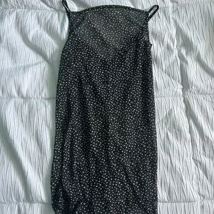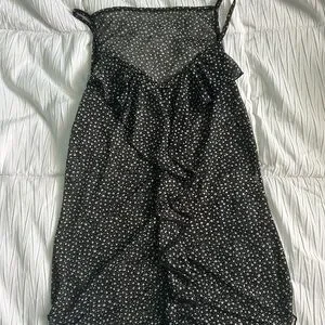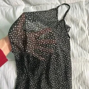 Sleek black top with a delicate white floral print. Thin spaghetti straps and a front ruffle detail. Lightweight and feminine. Easy to style for day or night.