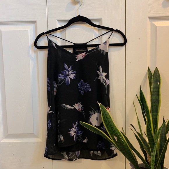This black tank top has pink and purple flowers and goes so nicely with jeans or a skirt! Can be casual or dressed up. Size M, but it fits tight in the chest.