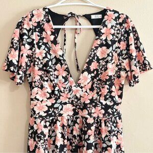 Black Flutter Sleeve A-Line Dress Pink Grey Floral & Deep V-Neck