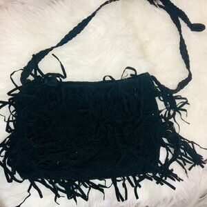 Trendy black fringe shoulder bag with braided adjustable strap and zipper closure.