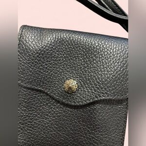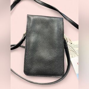 Sleek black leather crossbody bag with adjustable strap. Perfect for on-the-go style.