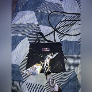 Small black crossbody bag with a geometric pattern. Features a gold clasp. Comes with a decorative scarf.