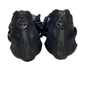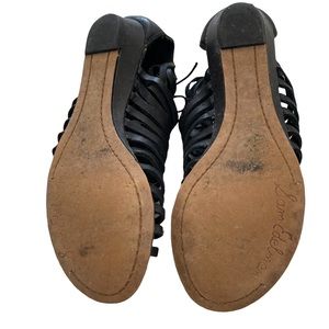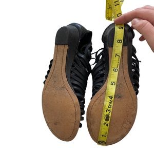 Sam Edelman faux leather tie up wrap gladiator sandals in good used condition. Fit about a 6.5 ladies, size has been worn off please see measurement in photo. Cute zipper detail at the back of the ankle with a kitten wedge heel.