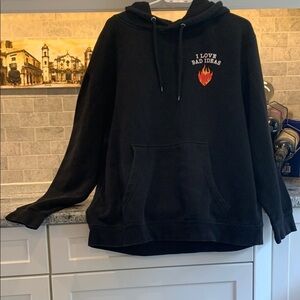 Black hoodie featuring a burning heart graphic and “I love bad ideas“ text. Comfortable for everyday wear. 80% cotton 20%. polyester. Like new condition Pit to pit is 26”. Check out my other listings and bundle to save. Questions? Leave in comments below.