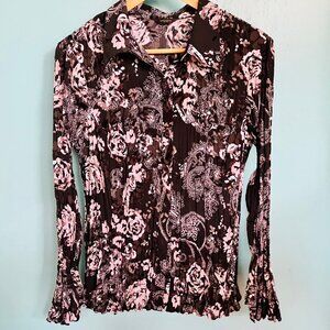 How can a shirt be fun and serious at the same time?!? Abstract florals in shades of grey and black get more interesting because of the 'pleated' fabric and body enhancing seams (see last pic of inside shirt). Ruffles on the end of the sleeves add a bit of flounce! Super comfy because of the pleated design.