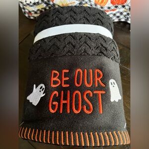 Cozy black blanket featuring a fun ghost design and 'Be Our Ghost' text in red. Perfect for Halloween decor.