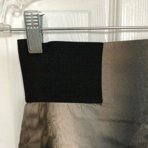 Black Halo pencil skirt with abstract ripple acid trippy print. Stretch waistband side panels with zipper and hook and eye closure in the back. Fully lined.