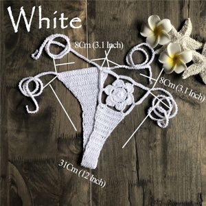 The Flower Micro Kini is the perfect Bikini bottom to match with a T shirt or any ( or none ) top. Hand crocheted cotton one size fits all.