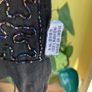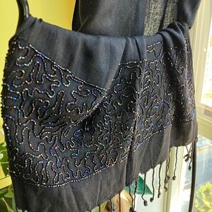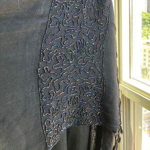 Black shawl with hand-beaded detail and bottom tassels. Made in India with 100% rayon. Length: 76 in. Width: 19 in.