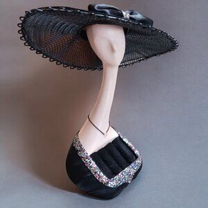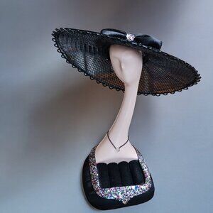 Black Hat Woman Figurine is a unique earring and ring display. This small figurine features a woman wearing a wide-brim hat adorned with loops around the rim to hang and display your earrings. The bottom neckline area is designed with slots to hold and display your rings. Decorated with AB glitter and mesh, this elegant piece stands 7 inches tall, making it a stylish and functional addition to your jewelry display collection. Cute decorative piece for your dressing table.