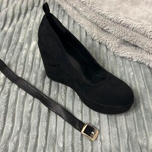 Black Suede Wedge Heels w 2.5” heel Heels that were bought for a dance but ended up going with a different pair. Great condition, just didn’t fit the best. Buckles can be removed for a different vibe. Will clean before sending. Smoke-free home.