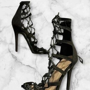 These stunning black sandals feature a high stiletto heel and an intricate cut-out pattern that creates a stylish lattice effect. The open-toe design and ankle strap provide both elegance and support, making them a perfect choice for any special occasion.