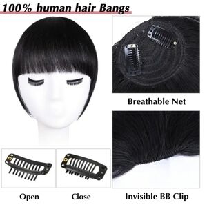 Jet black 100% human hair bangs measuring approximately around 6" long in the middle and 9" long on the fringed sides. Comes with two clips to secure them in place. Easily change up your look with these cute wispy bangs!