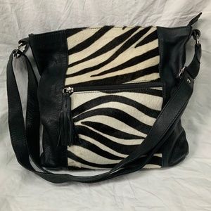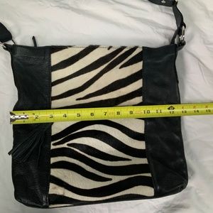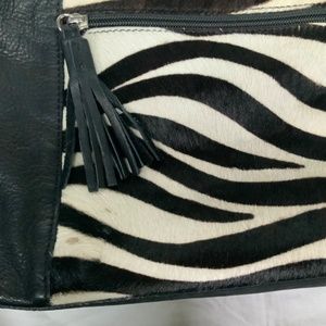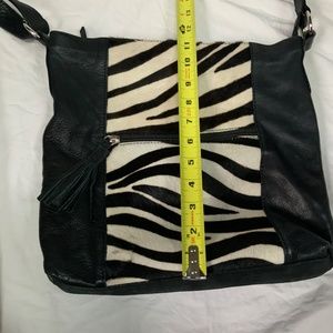This luxurious bag has one external zippered pocket, one inside zippered pocket, and on internal leather cellphone pocket. The zebra print hide on the front gives the bag a very unique look. This feels like a one-of-a-kind. The leather is soft, and the bag is in excellent, clean condition, both inside and out. The strap can be lengthened to make this a crossbody bag as well. Maurizio Taiuti is an Italian designer.