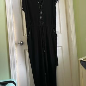 Calvin Klein black jumpsuit with gold button details.