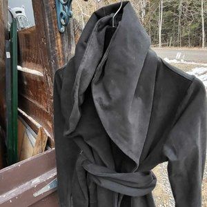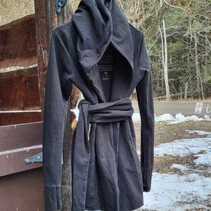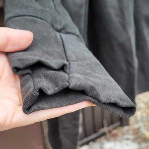 It looks like these sweaters are no longer made which is a shame because this is the nicest sweatshirt you will ever own. The first Kania sweater I found in the wild (thrift ;) and knew I had to get one new as well because they are just so ... "posh" :) Poshmark has taught me fashion terms like "fairycore" and "lagenlook", I think it falls under both a bit?? The hood is oversized which feels so nice to me but the sweater itself is form fitting with the little holes for your thumbs in the sleeves. It comes with a long detached belt that can be used around the waist or neck. It has never seen the inside of a dryer but has faded over the years (the camera picks up more fade than the naked eye does) so it could do with a nice black dye wash to bring some of the color back to life but other than that the stitching is all fine and there are no stains, rips or holes .... The quality of the material will last you ages if you don't wash and dry it too roughly. This sweater is well loved but in good condition.