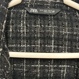 Chic black Zara blazer featuring stylish knit detailing for a unique twist on a classic piece. Tailored fit with structured shoulders—perfect for office wear or dressing up any outfit. Gently worn and in excellent condition.