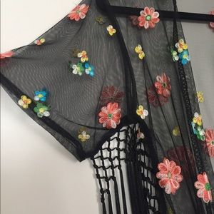 Beautiful black lace cardigan with colourful embroidered flowers and silk-like tassels. Beautiful for summer!