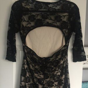 Black lace 3/4 sleeve mini dress with sexy back cut out. Lace mesh has black floral print, that sits overtop a solid beige underpiece.