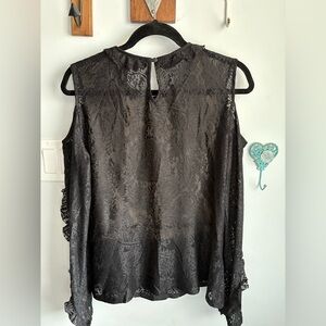 Elegant black lace top with ruffle detailing. Open Shoulder