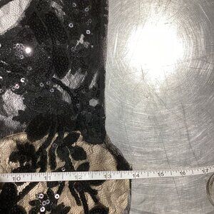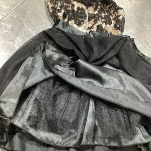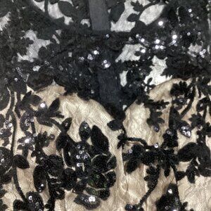 Gorgeous sleeveless black fit-and-flare cocktail dress featuring a nude illusion bodice with intricate black floral lace overlay and sequin accents. The bodice is finished with a sheer lace neckline and a satin ribbon tie at the waist for a flattering silhouette. The skirt is made from layers of soft black tulle, giving it volume and movement—perfect for dances, parties, or formal events.