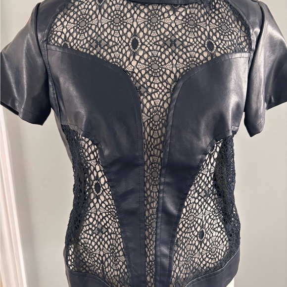 Stylish dark navy blue top featuring intricate lace and vegan leather design. Perfect for a chic look.
