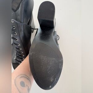 Features a sleek faux leather finish, adjustable lace-up front, and a comfortable block heel that’s easy to walk in.