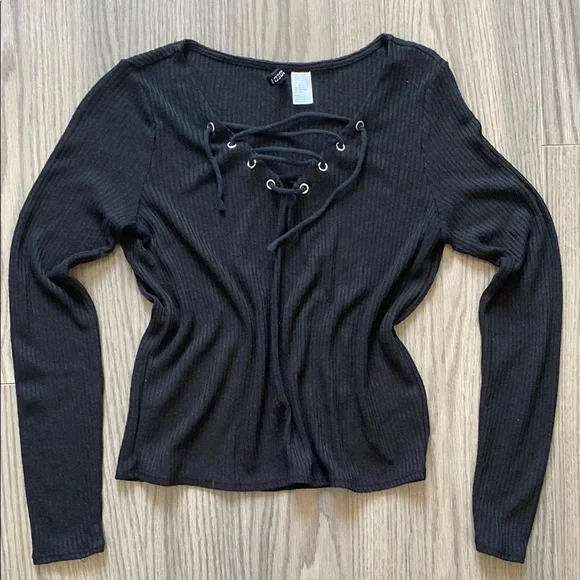 Elevate your style with this chic black lace-up ribbed top. Perfect for any occasion, this top offers both comfort and elegance.