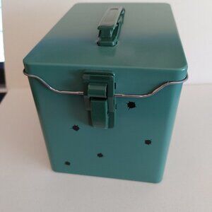 The ammo box is 5" x 3.5" x 3.75" tall. It is metal.