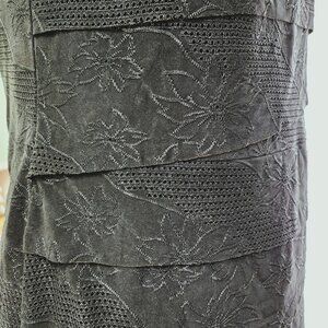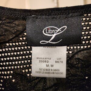 Libra Black Layered sleeveless Ruffle Lace Blouse with Floral Motif. Size Medium. Acetate and Spandex. Light weight and flowy. Vented Back. Scoop necked. Great overall preloved condition. Fabric has some stretch to it. 18 inches aprox pit to pit. 24 inches aprox shoulder to hem.