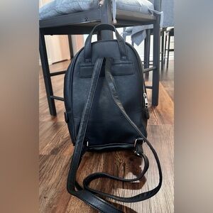Sleek and stylish black faux leather backpack perfect for everyday use. Features a front zip pocket for easy access to essentials. Gently used with minimal signs of wear.