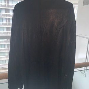 This beautiful black lamb skin leather blazer has 2 front buttons, zippers and 3 buttons on each distressed sleeve, as well as a distressed tail. I do not recognize the designer brand. It is in immaculate condition. Worn once as it is too big for me.