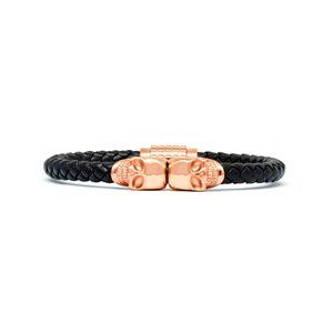 Black Leather Bracelet with Two Rose Gold Skulls and Magnetic Clasp