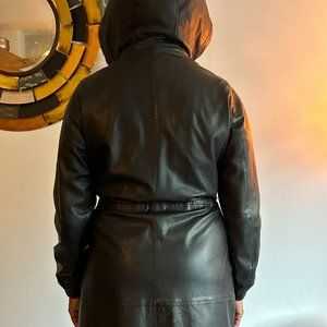 Discover sleek allure with this Black Leather Coat from Massimo Dutti. Drawstring waist, hood, & front zipper blend fashion & function. Size Medium. Knee length.