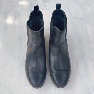 Gorgeous classic chelsea boots in soft black leahter, featuring elastic at side as classic chelsea boots have, back tab/pull, brown wooden block heel soled with rubber, and almond-shaped toe