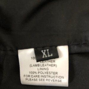 Beautiful lined, soft leather jacket with a smocked look has crewneck collar, chain trim neckline and front, front placket with snap closures, ruffled patch pockets with flaps, zippers on sleeves and low/high hemline. Jacket sits on or above hip and has some stretch. Elegant jacket to dress up jeans or wear with anything.