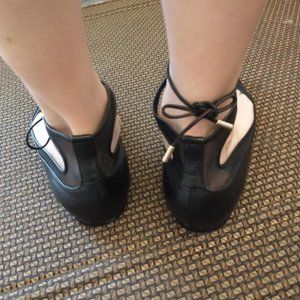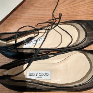Very good condition. Black leather Jimmy Choo ballet flats with mesh accents at tops, stacked heels and tie closures at ankles. Minor indentation on left toe, minor scuffing on outer right heel and inner left heel...see pictures.
