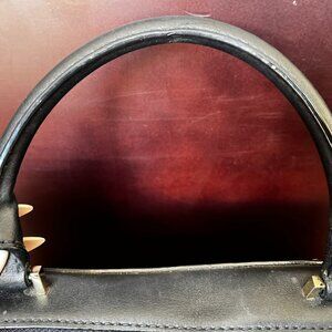 Well loved black leather Kate Spade Helena Studded satchel bag. The crossbody strap for this bag is missing, as well as two of the studs (one on the front and one on the back). Studs are also slightly discoloured due to use. Leather has some slight water staining on the back. This bag is well loved, but has plenty of life left, and is a gorgeous bag.